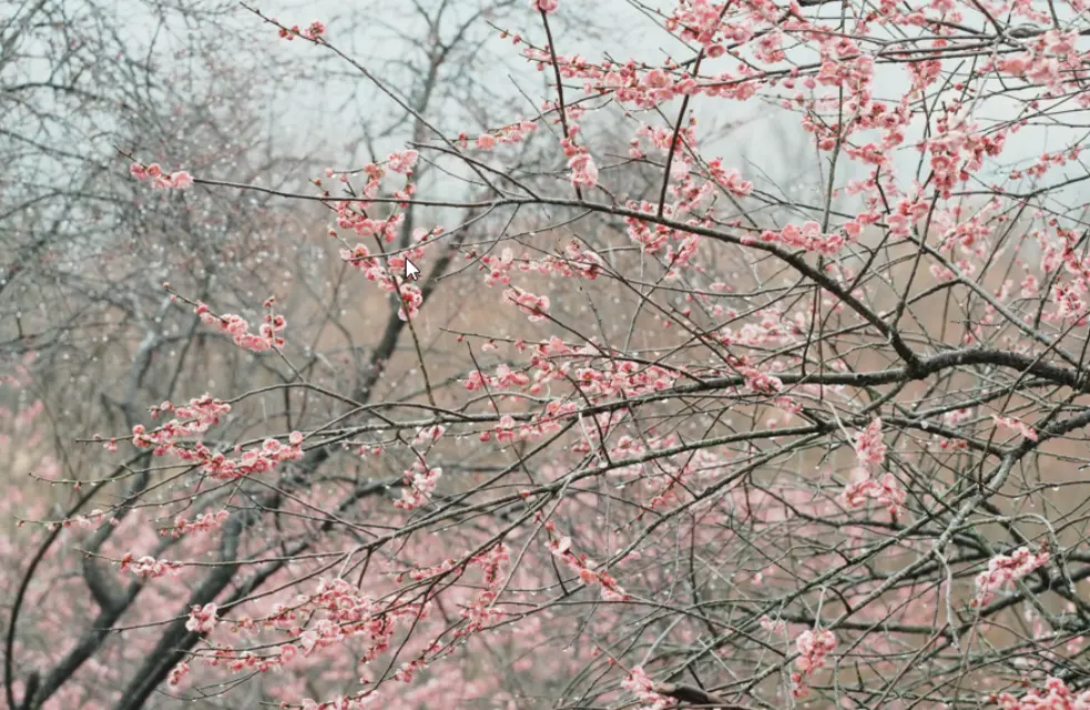 在半山腰,粉色的梅花成片开,其中也有几颗白色的梅花,互相映衬。