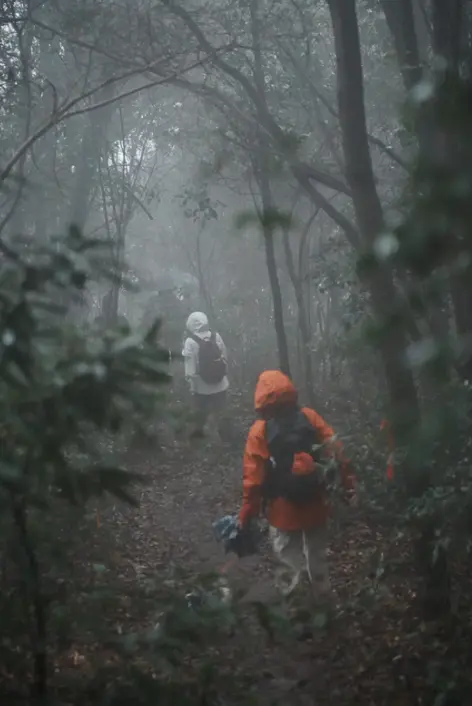 继续往里走,雾越来越浓,四周静得出奇,只剩雨点敲在叶子上的声音,和我们急促的呼吸