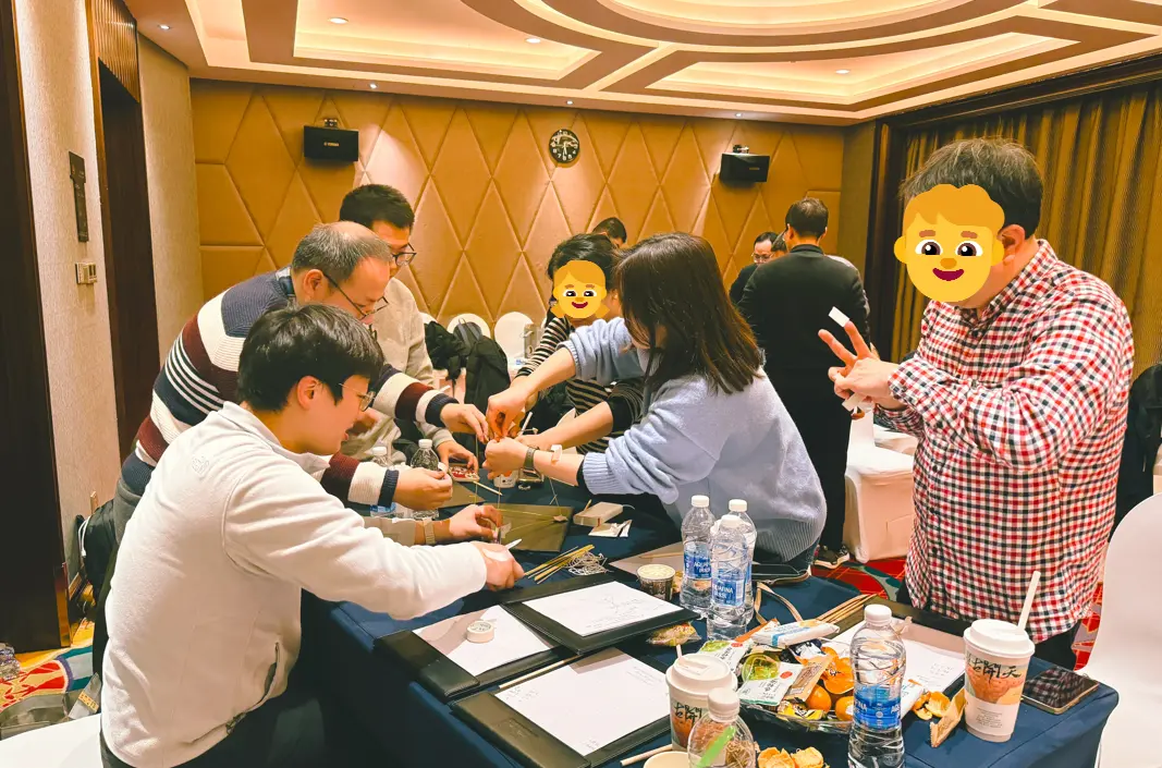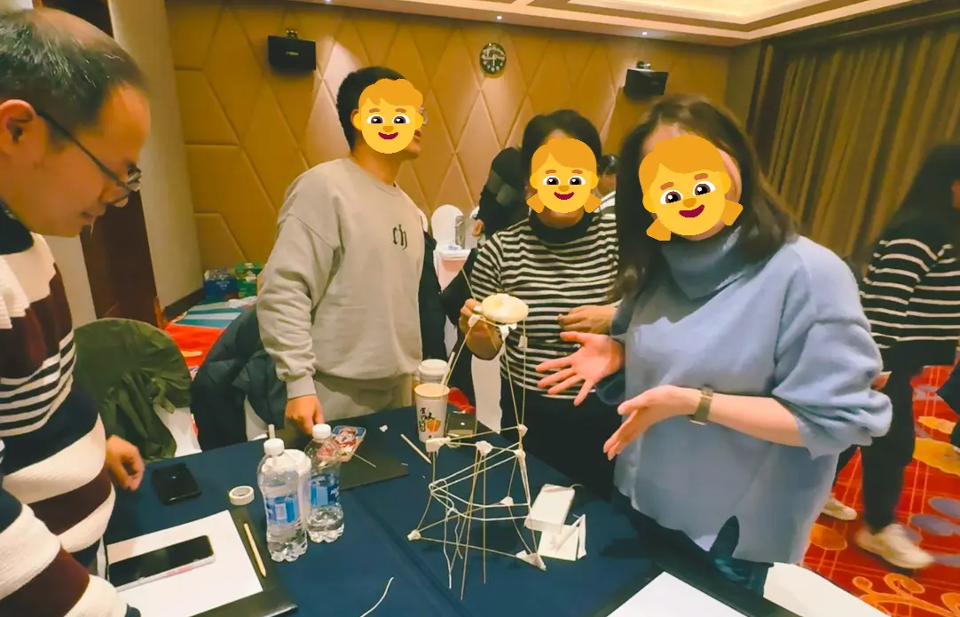 本次活动之一是利用分发的木棍、双面胶与圆盘状饼干搭建一座独立式高塔,塔体需保持结构稳定,且顶端需成功放置一块饼干作为最终标志,最后以塔身的垂直高度作为评判标准,蛮有趣