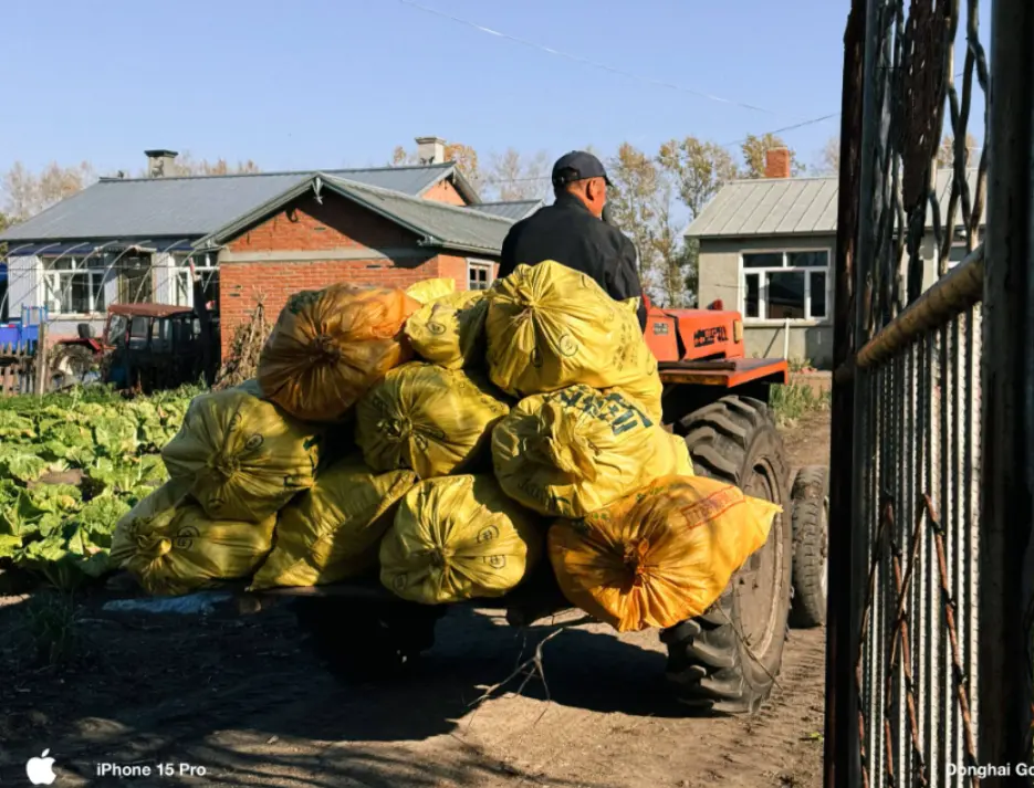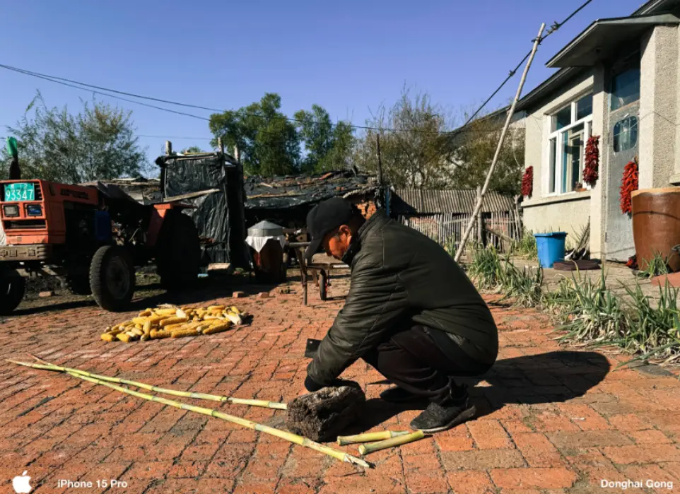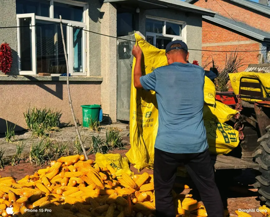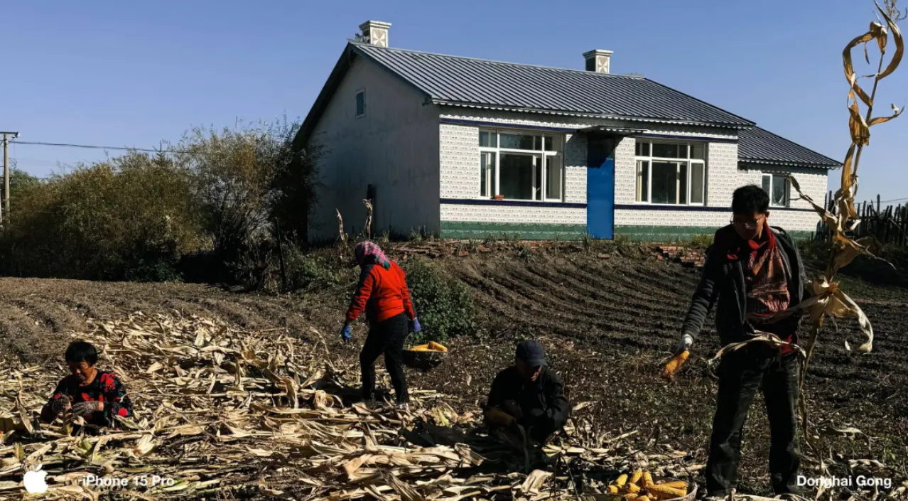 饭后上炕眯了一会儿,下午出发掰苞米。三块地看着不大,真干起来才知道累,我这种纯外行,全靠蛮力,一根一根拧,他们是老司机,一块小木片一挑一掰,直接进筐。