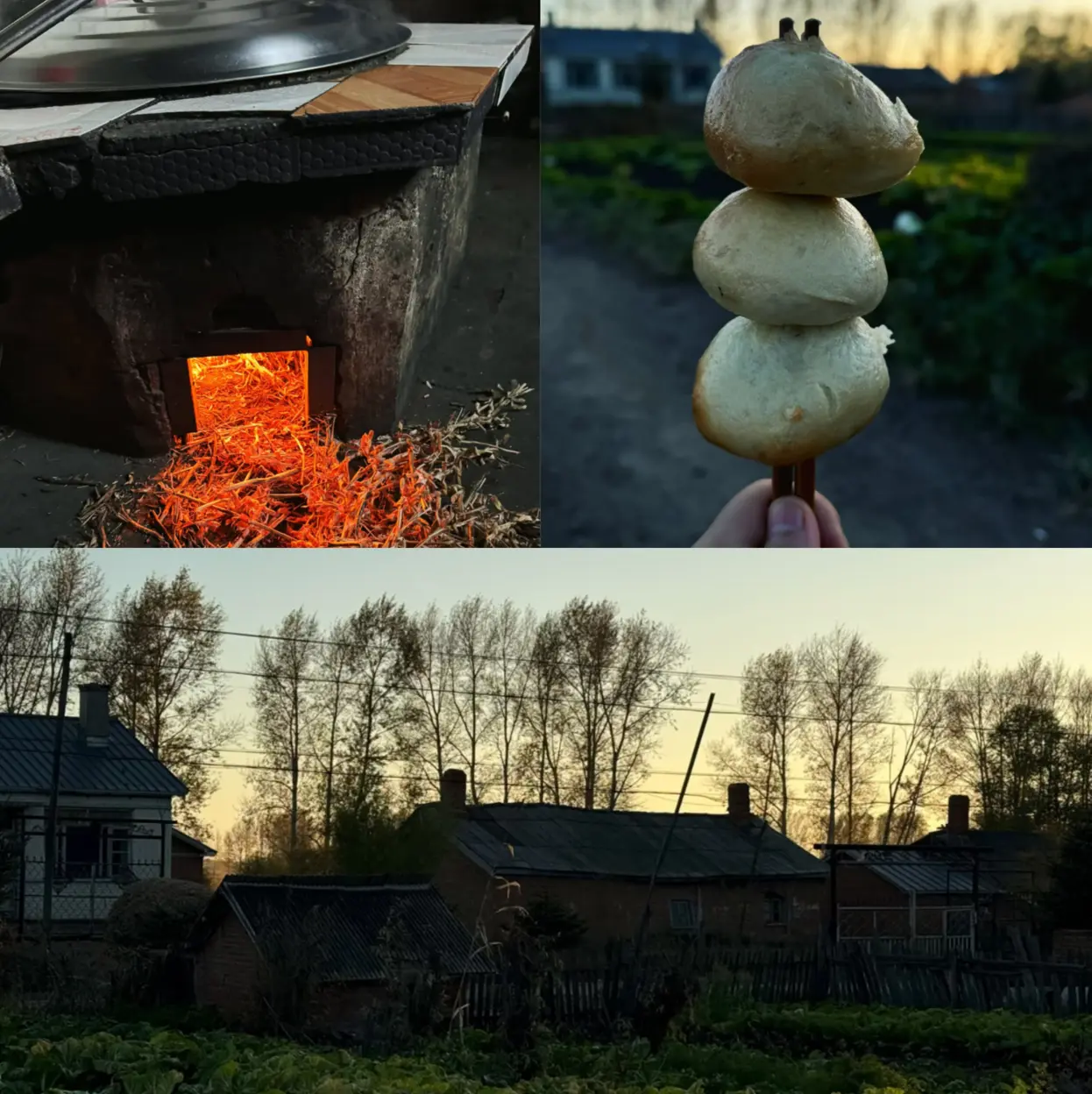 自己用土灶热馒头,火大了点,底都焦了,但有柴火香,意外地好吃。